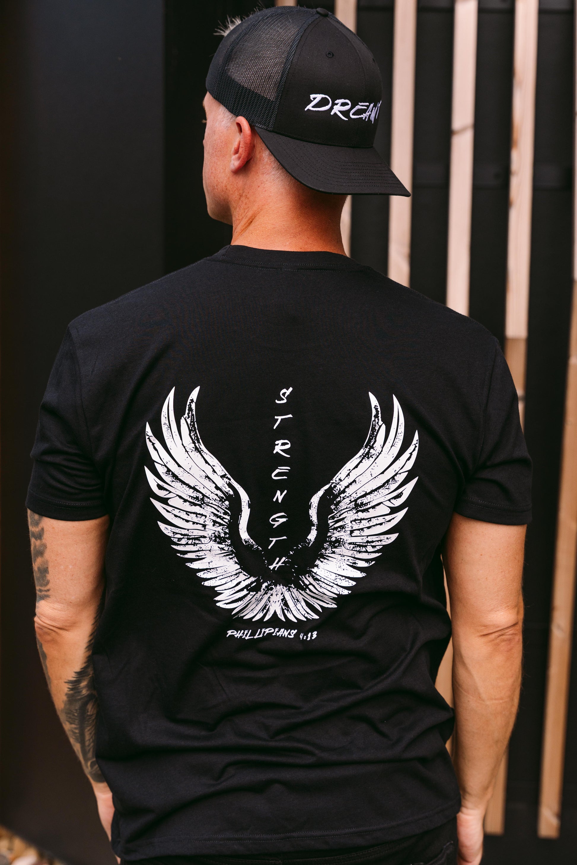Let your style speak strength. The "Strength" tee is designed as a symbol of unshakable faith, featuring a clean, powerful graphic of an angel wing paired with the word “Strength.”